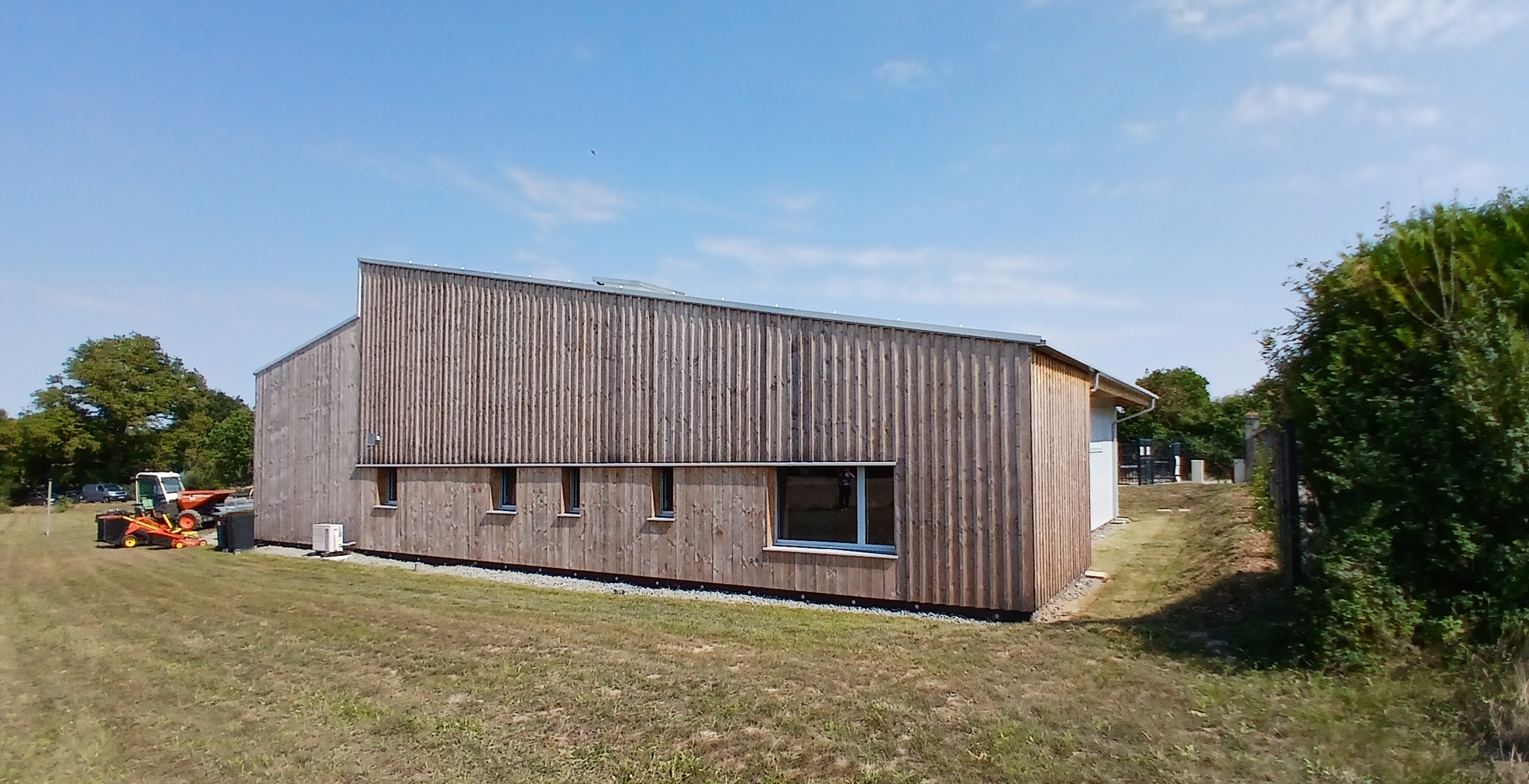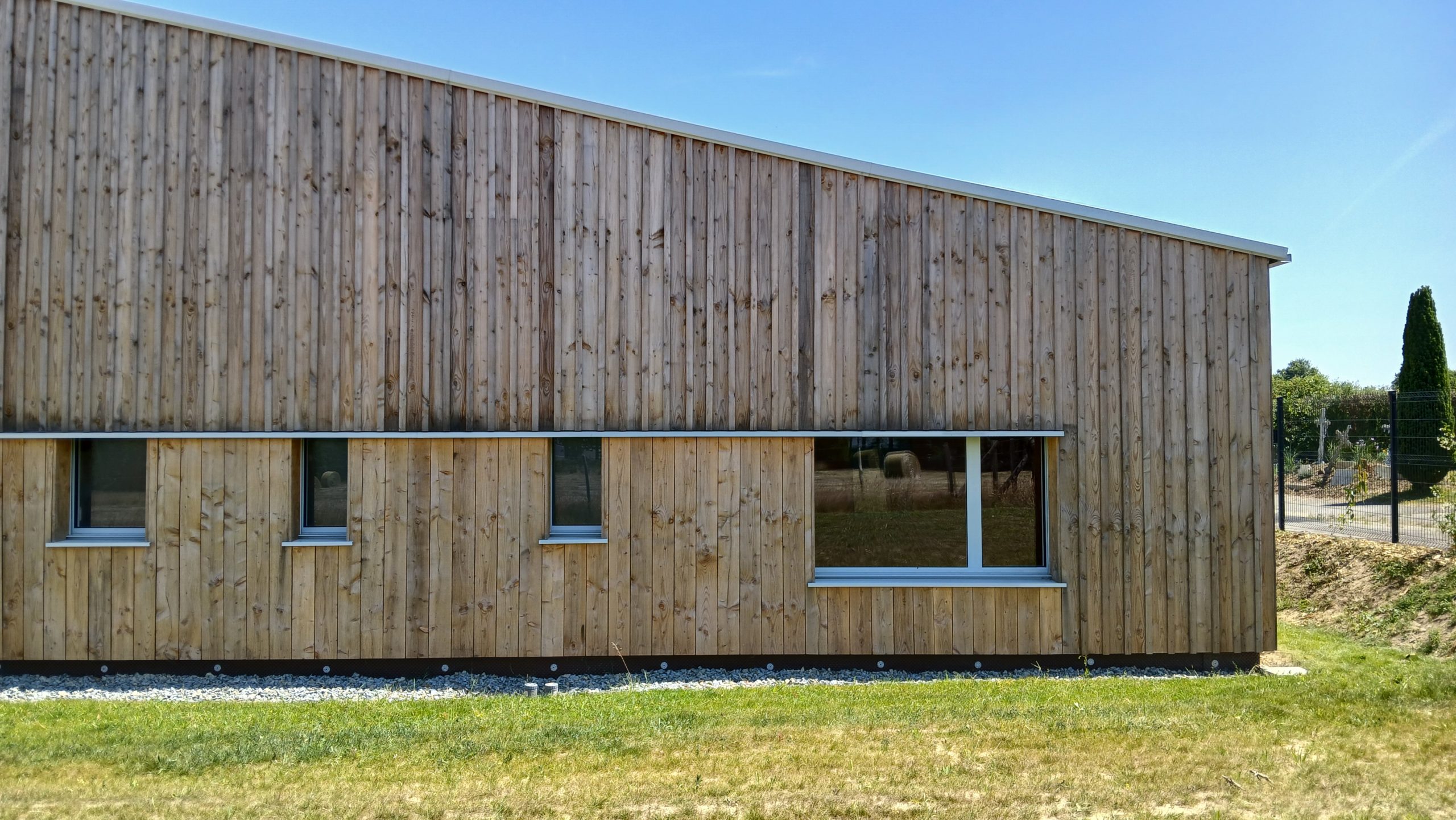 Dans une démarche d’intégration et de préservation de l’environnement, les matériaux choisis pour réaliser ce bâtiment sont le bois (en structure et bardage), l’aluminium de teinte claire (en bardage), et des isolants biosourcés pour la partie chauffée. Les différents bardages différencient les bureaux de l’atelier.