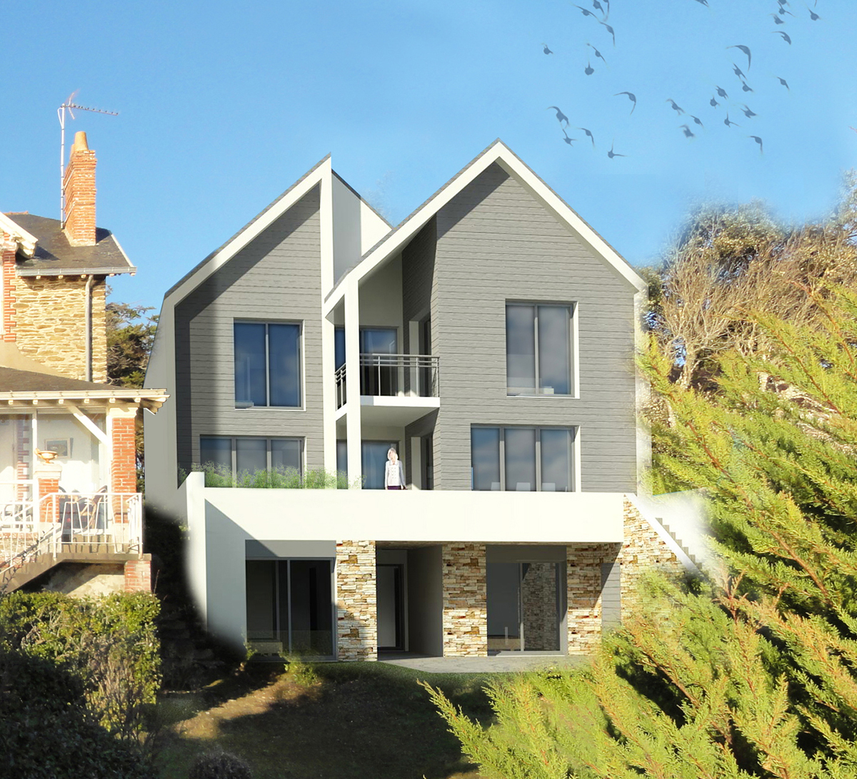 Pour rester dans un gabarit proche de la villa Ker Silène, le projet donne en façades une impression de deux volumes imbriqués et décalés. Ce décalage ménage un retrait assurant la luminosité du pignon de la villa Ker silène.